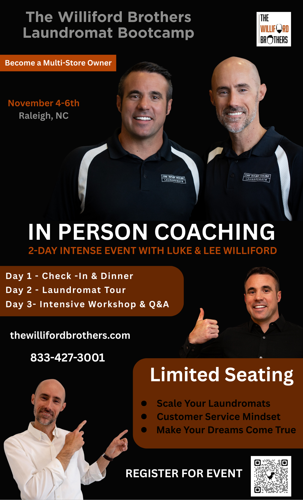 Learn the laundromat business first hand from Luke and Lee Williford. 2 Full Days of intense learning! You will learn how to open your first laundromat or scale your existing laundromats! We love getting together in person and teaching others how to successfully and profitably operate laundromats! We can't wait to meet you and show you our laundromats and help you build yours!